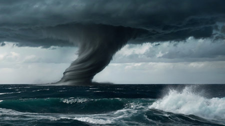 Big tornado in the sea. Stormy weather. Big wave.