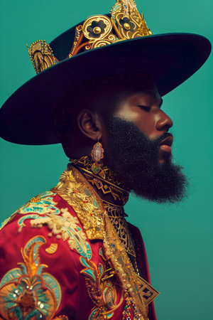 A man wearing a crown and gold jewelry poses for a photo. The image has a regal and luxurious feel to it, with the man dressed in a red and gold outfit