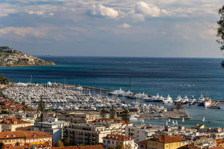 Panoramic seascape view of Imperia old town and port with boats, Liguria, Italy