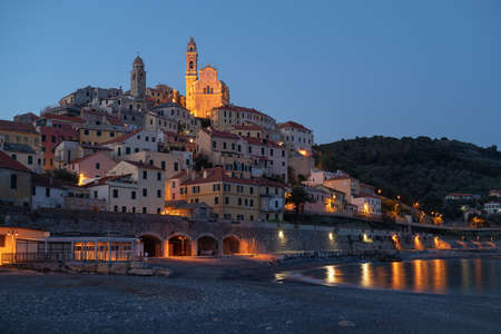 Cervo medieval village by night, Province of Imperia, Liguria region of Italy