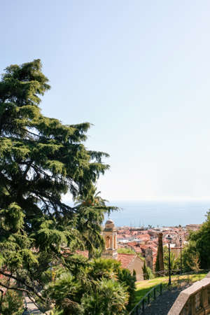 View of Sanremo visible through lush greenery, Italy