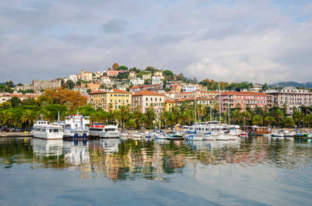 La Spezia, Italy - November 4, 2015: A general view of the city of La Spezia, the chief Italian naval station and arsenal, from the city's port, showing marina and palm-lined water front Morin