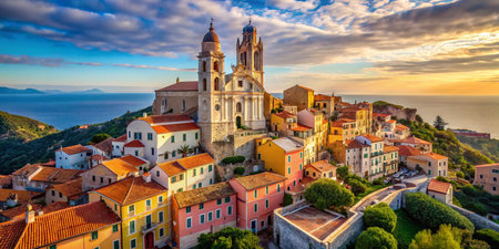 The old town of Cervo, Liguria, Italy, with the beautiful baroque church Arising from the houses. Clear blue sky.