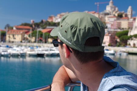 Man looking at the waterfront of the Riviera di Ponente - Liguria, Italy