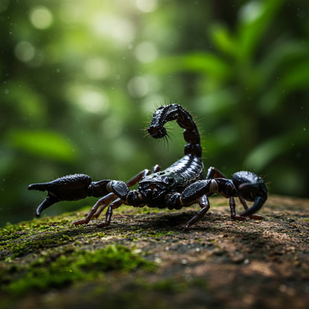 A striking black scorpion featuring prominent pincers and a delicately curved tail, perfectly highlighting the fascinating intricacies of nature.