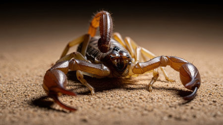 A detailed view of a venomous scorpion in its natural desert habitat, showcasing its segmented body and sharp pincers