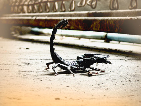 The Asian giant scorpion.black hard shell .Heterometrus species,showing Tail wagging, preparing to fight,blurry light around