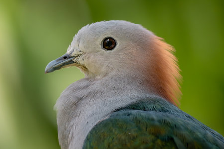 A bright - colored dove with bright green wings , red bill and ash -gray forehead.