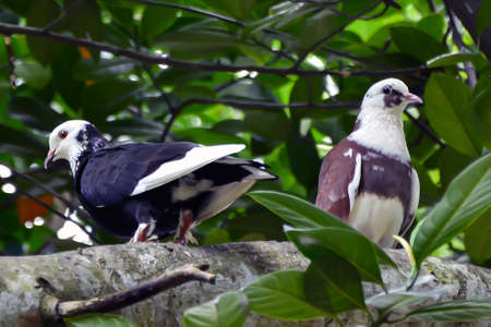Close shot of white headed pigeons sitting on the tree branch with green leaves background. Two birds standing opposite on the tree branch.