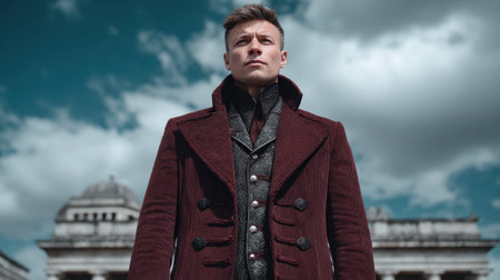 A confident young man stands tall in a stylish coat against a backdrop of dramatic clouds and historic architecture, conveying strength and elegance.