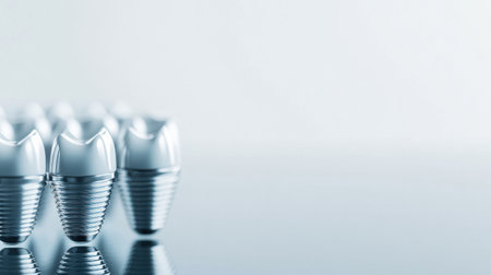 A row of dental implants sits on a clean white surface, showing their metal and ceramic features, with space for more text.