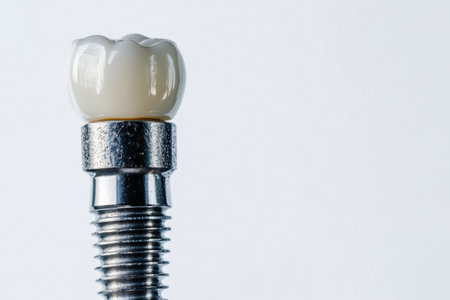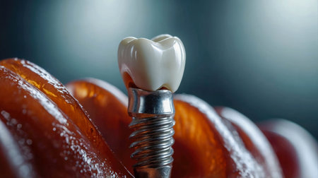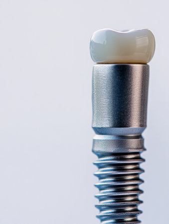 Detailed view of a dental implant highlighting metal texture and ceramic crown, designed for aesthetic restoration and durability.