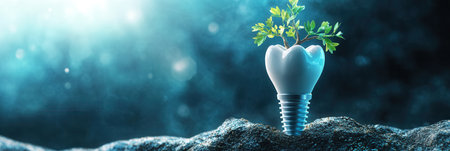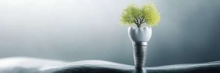 A strong tooth implant emerges from healthy gums, resembling a tree, symbolizing vitality and health in a conceptual artistic representation.