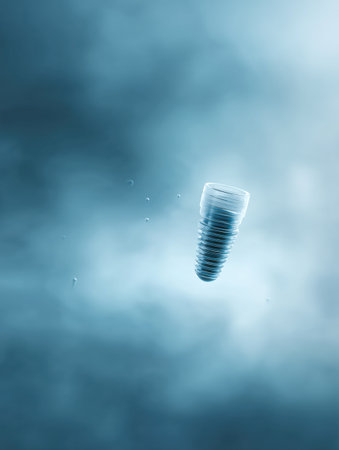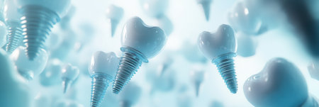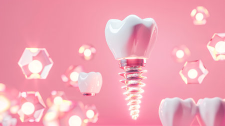 Conceptual representation showcases titanium dental implants in a visually striking abstract environment with molecular motifs in blue and white hues.