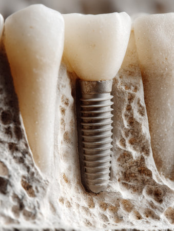 Close examination highlights a dental implant seamlessly embedded in natural bone.