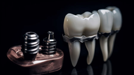 Close-up of a crown being installed on a dental implant in a laboratory setting. Generative AI