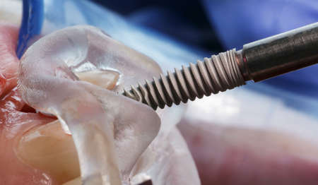 Close-up of the hands of a dentist surgeon on implantation, with dental instrument and surgical template