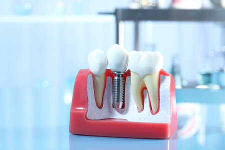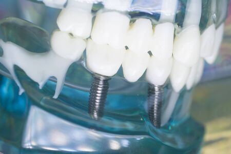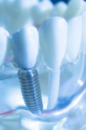 Dental titanium aesthetic orthodontic tooth implant in dentists mouth teeth model closeup isolated.