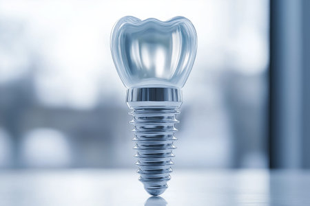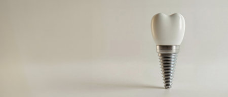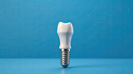 A closeup view of a dental implant model with a realistic tooth crown, ideal for medical and dental content