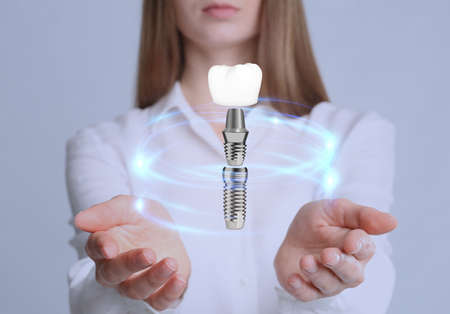 Doctor demonstrating virtual image of dental implant on light background, closeup