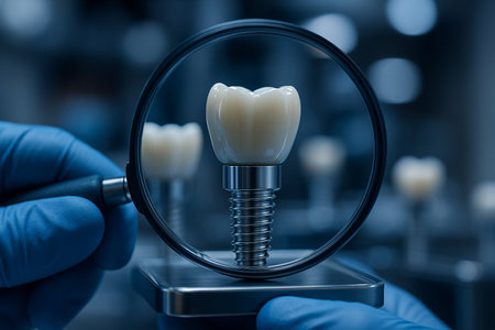 AI generated closeup of a dental implant under magnifying glass showing clinical accuracy cleanliness and professionalism in dental technology scene