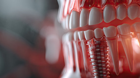 Close-up view of dental implants and prosthetic teeth in high detail