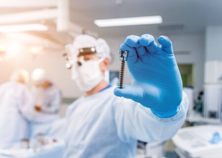 Spinal surgery. Surgeon show polyaxial screw in operating room