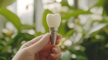 A person holds a dental implant model resembling a tooth in front of lush green foliage, symbolizing innovation in dental care and technology.