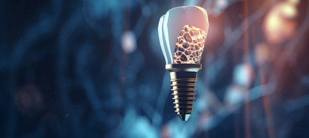 Realistic and detailed illustration depicting a futuristic dental implant in the jawbone, showing advanced technological and design elements against an intricate background.