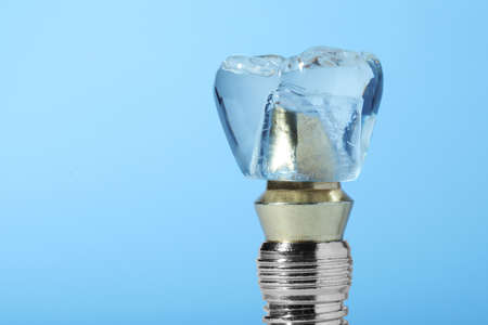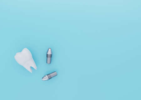 Tooth Crown and Dental Implants on blue background with copy space, dental implantation, artificial tooth, 3d render