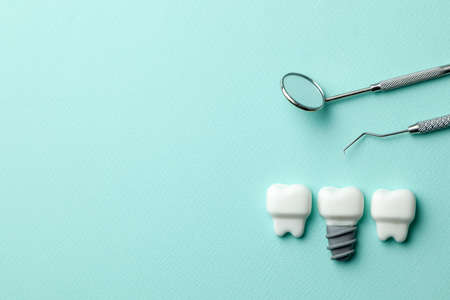 Healthy white teeth and implants on green mint background and dentist tools mirror, hook. Copy space for text