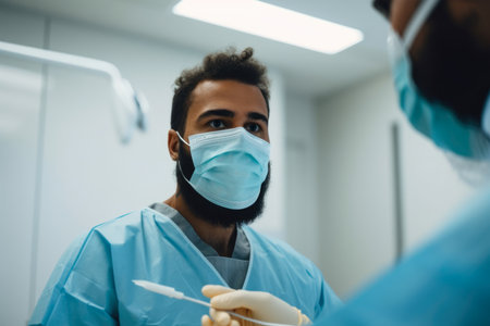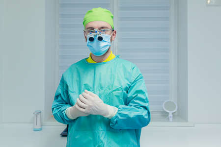 Serious male dentist wearing surgical mask and gloves, preparing for a dental procedure in a clean, sterile environment