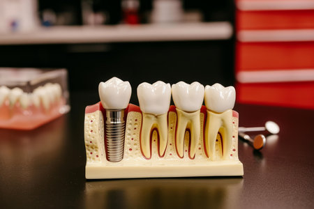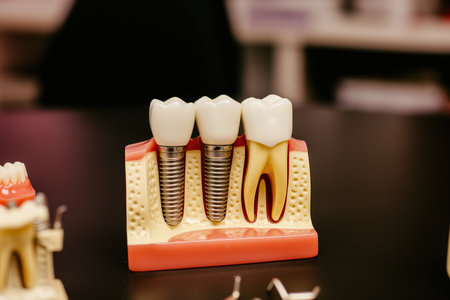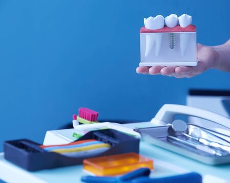 Dental model of human teeth and implant in dental office.