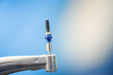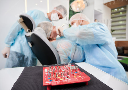Close up of dental implant surgical kit with doctors and patient on blurred background. Dentist using dental implant machine while performing implantology procedure in dental office.