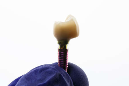 temporary dental crown on a replica implant, in the hand of a doctor on a white background