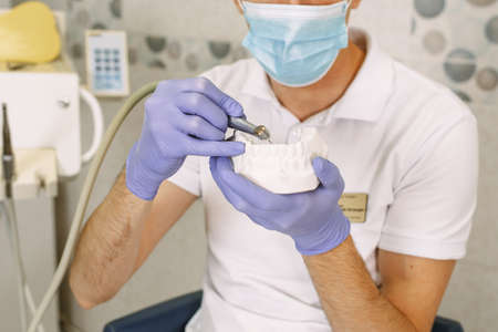 The dentist shows on the artificial jaw how he drills a tooth, removing caries. Concentrated dentist with jaw samples tooth model in dental office professional dental clinic.