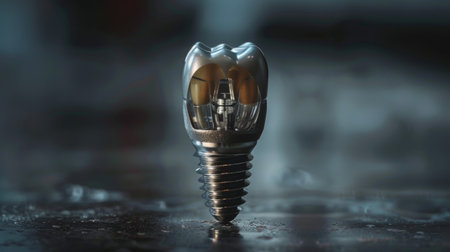 Close-up of a dental implant model on a reflective surface with detailed craftsmanship