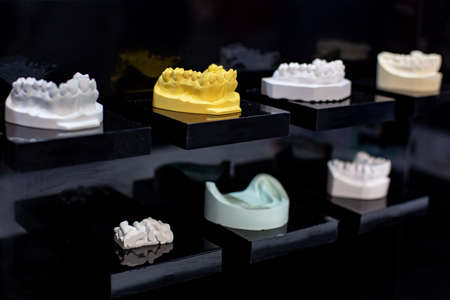 Dental prostheses top view. Jaw models with different problems. Dental disease treatment concept. Plaster models of human prostheses. Dental equipment. Demonstration models of dentures.