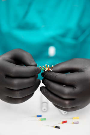 Close-up dental instruments for removal of dental nerves on a white background, selective focus. copyspace