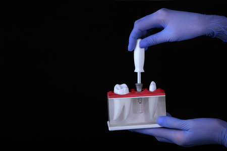 Demonstration of installation of a dental implant.The concept of dentistry and dental care. Dental implant. Black background. Copy space.