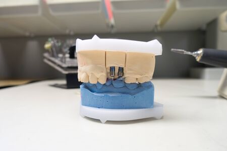 gypsum model of the human jaw with dental implants