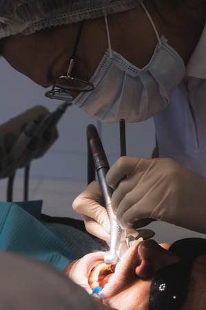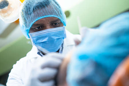 Close up of dentist busy operating surgery at hospital - concept of dental care, toothache treatment and profesional occupation.
