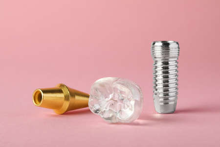 Parts of dental implant on pink background, closeup