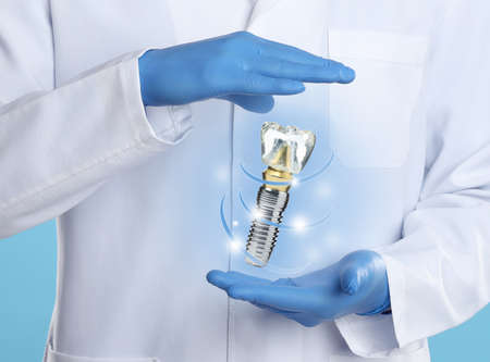 Doctor demonstrating virtual model of dental implant on light blue background, closeup