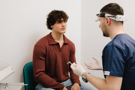 Consultation in ENT doctor otolaryngologist. Male patient is listening to ENT doctor consultation before a rhinoplasty or septoplasty surgery