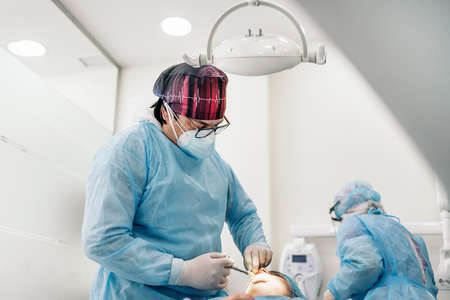 Male old professional dentist surgeon in uniform and female assistant helps to performing operation install dental implant teeth of woman patient in clinic light office with modern tools equipment