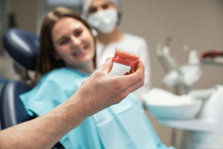 The dentist shows an artificial model of the jaw with braces and points to it with a dental tool. dentist in purple rubber gloves shows new dental braces for patients.