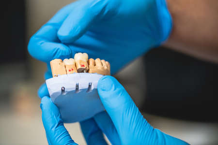 hands of the dentist hold a breadboard model of the tooth with an implant