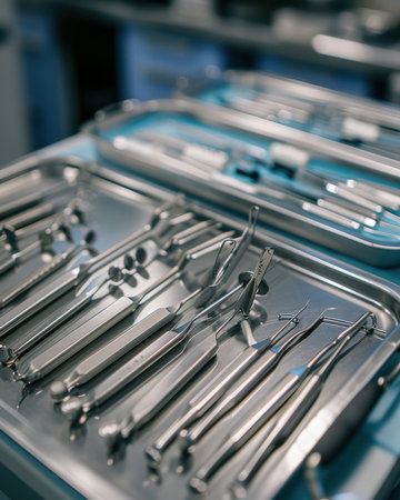 A close up of a tray of surgical instruments on a table, showcasing precise engineering and shiny nickel metal under electric blue lighting