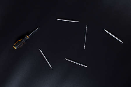 Small electronic repair screwdrivers and other tools on black background.